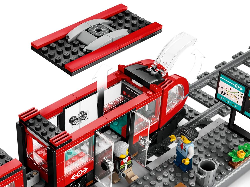 Конструкторы для детей, которые любят играть – В игрушечном трамвае есть сиденья для минифигурок и открывающиеся двустворчатые двери, а на платформе станции имеются выдвижные мостики для посадки.