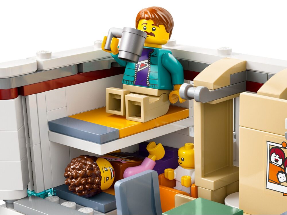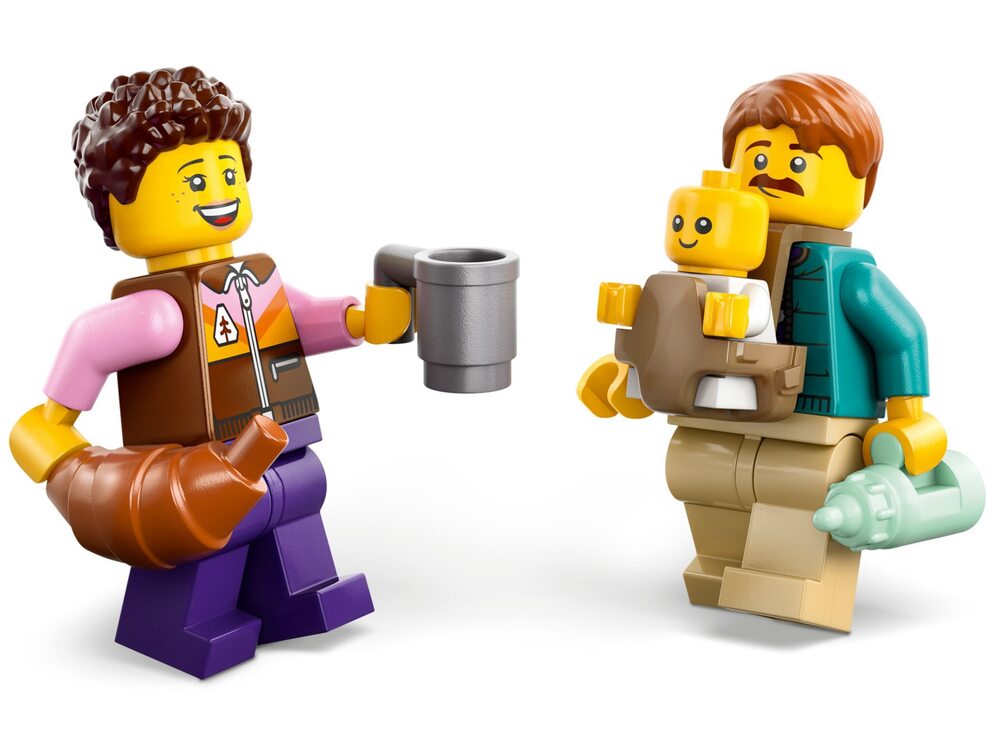 - Минифигурки и аксессуары: В набор входят 2 минифигурки — мама и папа, а также фигурка ребенка. Дополняют игру аксессуары: гитара, бутылочка для малыша, 2 кружки и круассан.