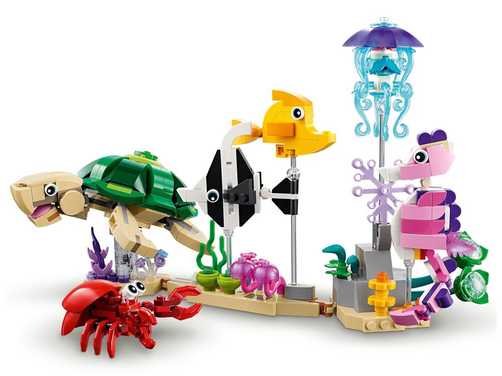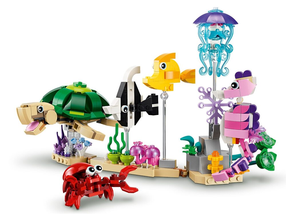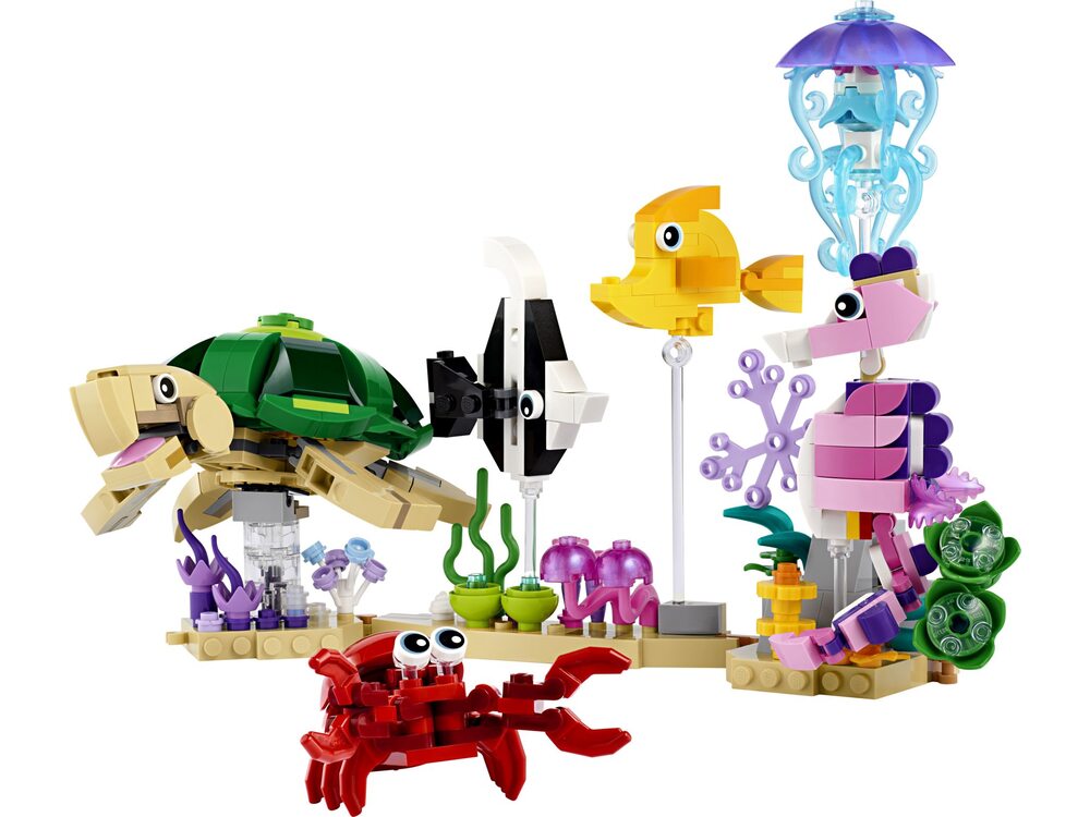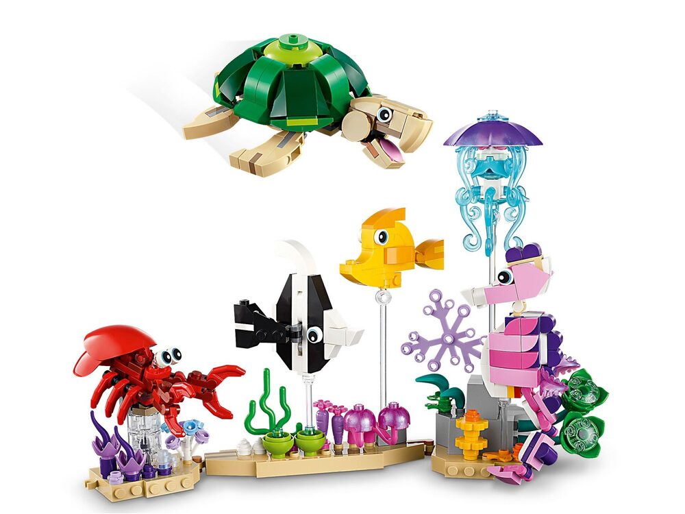 Подставки для моделей. Все три игрушечные рыбки LEGO имеют собственные подставки на морском дне, украшенные морскими растениями, а многие морские животные представлены на прозрачных стержнях.
