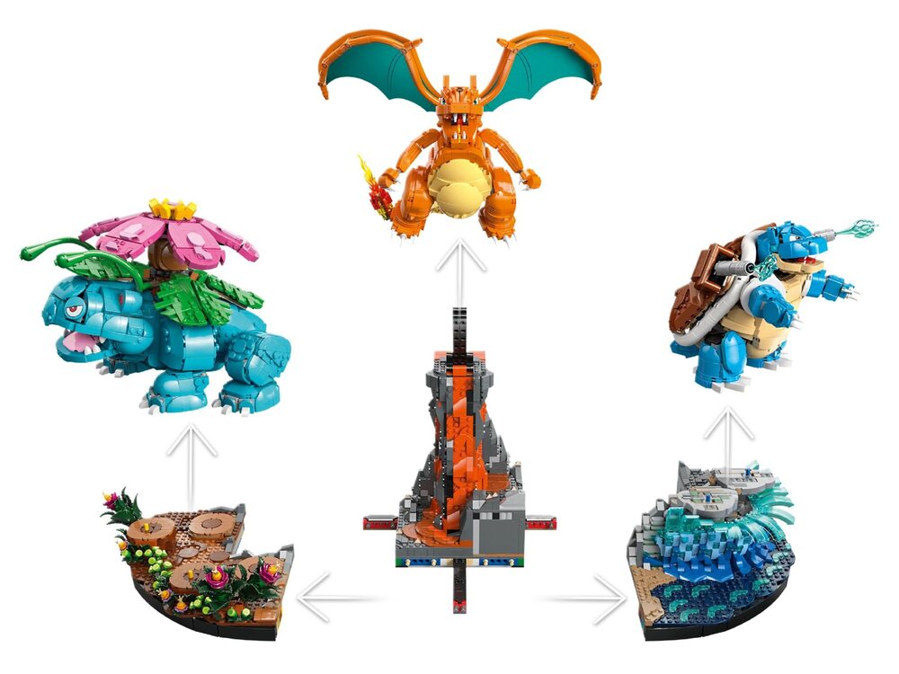 Покемоны могут устанавливаться отдельно или размещаться на тематических подставках-биомах: пляж для Бластойза, джунгли для Венузавра и вулкан для Чаризарда. Подставки соединяются между собой, формируя единую эпическую арену боя. Внутри конструкции спрятан специальный «пасхальный сюрприз» для внимательных сборщиков.